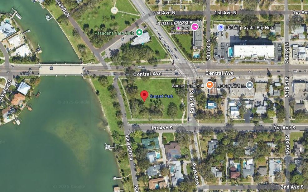 The Sunshine City Mosaic is located in Sunset Park in St Petersburg, FL – on Central Avenue and Park Street, right on the way to Treasure Island and the areas famed beaches. Click on the image for a Google Map Link.